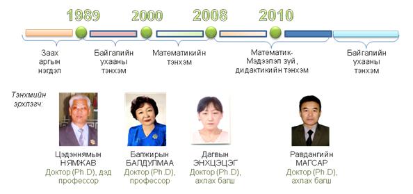 - 2008-2010 он хүртэл “Математик, мэдээлэл зүй, дидактикийн тэнхэм” болж, тэнхмийн эрхлэгчээр доктор, ахлах багш Д.Энхцэцэг ажилласан.